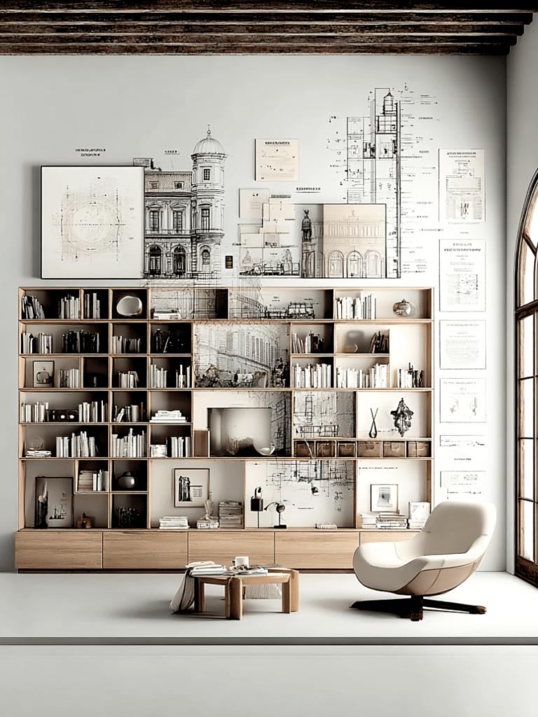 Incluant des rangements horizontaux suspendus au mur ainsi que quelques étagères décoratives modulables.