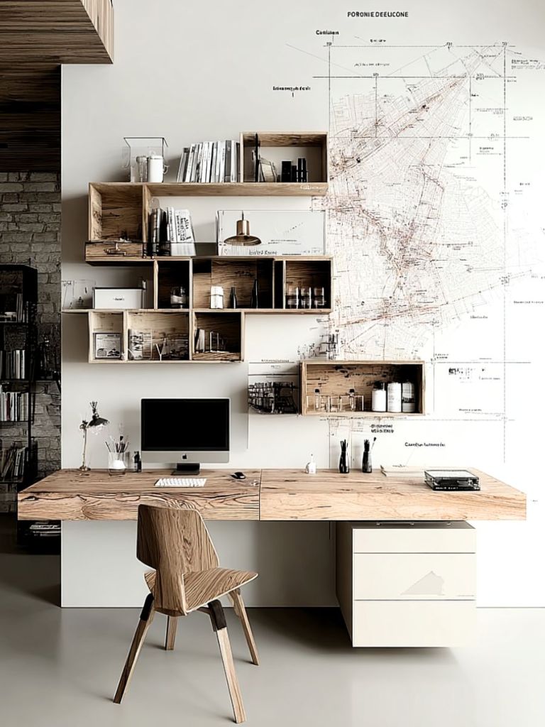 Intégrant un magnifique plateau de bureau en bois, quelques étagéres décoratives et un meuble de rangement.