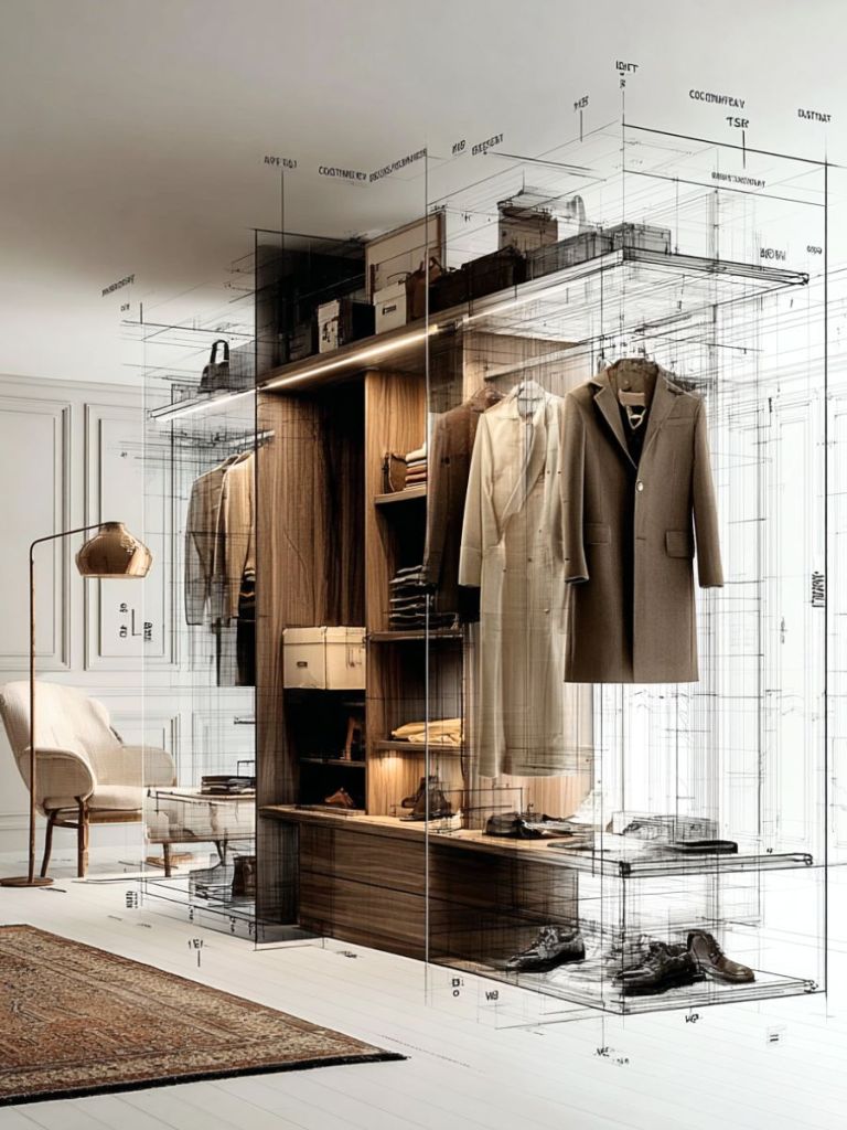 Élaboré avec les équipements suivants: tiroirs, étagères, tringles, casiers. Il peut également s’agrémenter d’éclairages décoratifs.