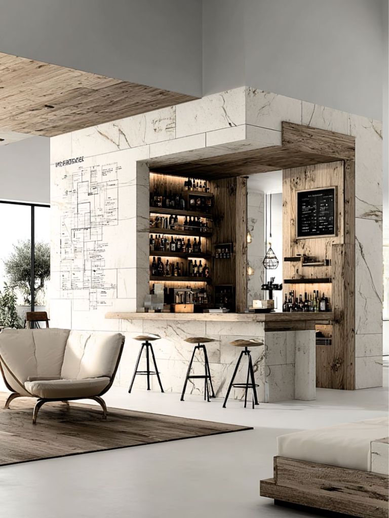 Élaboré avec un plan de travail en quartz ou en céramique, de meubles bas à portes ou à tiroirs, ainsi que d’étagères décoratives. Une petite cave à vin est également incluse.