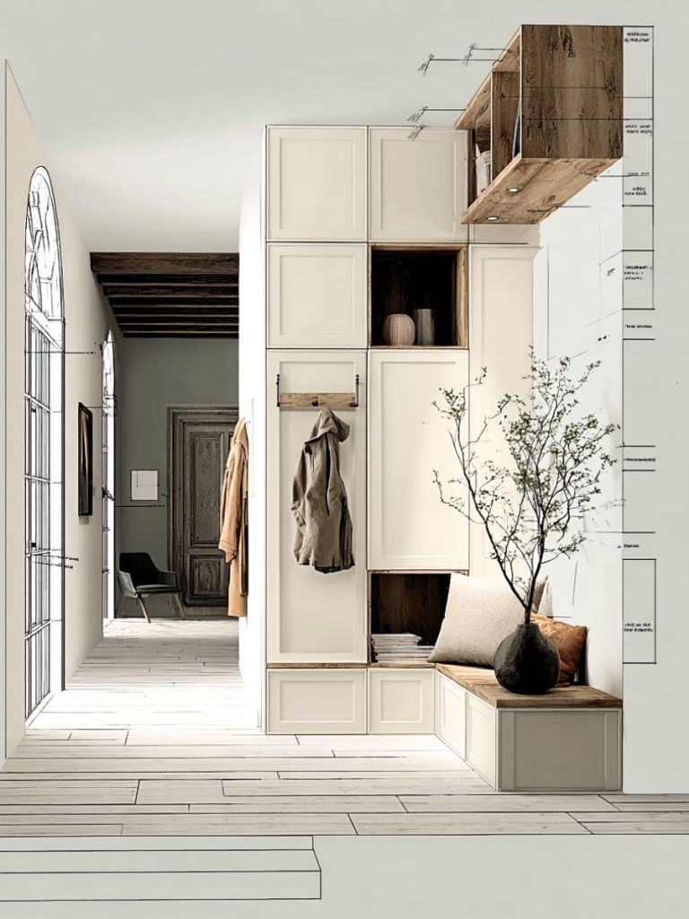 Composé d’une banquette avec placards, de meubles alternant penderie, rangements fermés et ouverts.