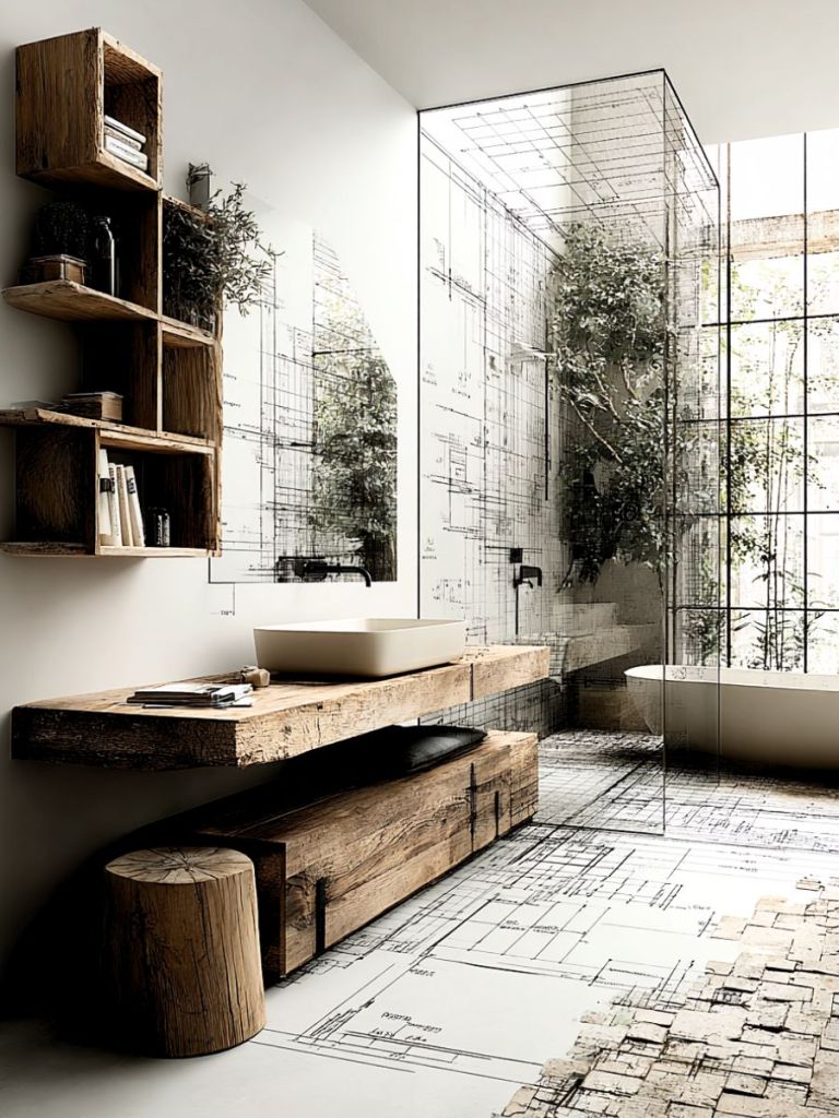 Intégrant un superbe plan vasque, des meubles bas coulissants, des étagéres décoratives et un grand miroir.