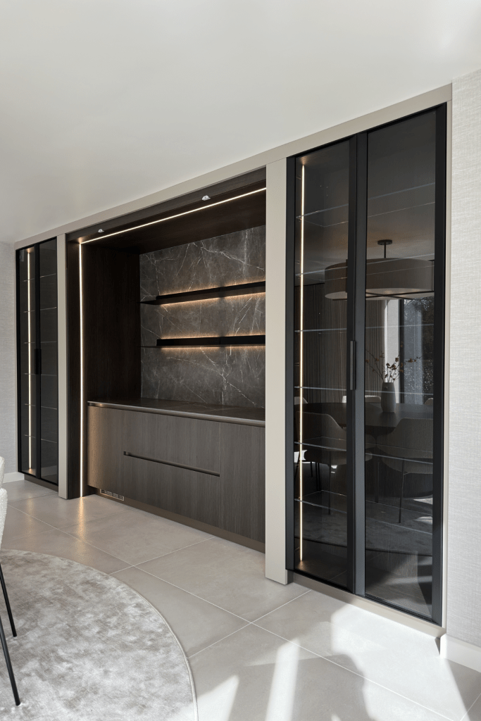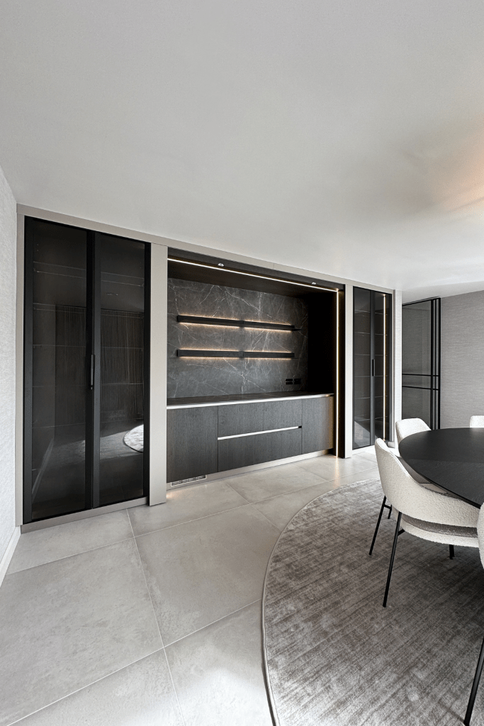 Sur l’un des pans de mur d’une salle à manger se dessine les lignes discrètes d’un bar. Ses portes rétractables viennent dissimuler la partie centrale du linéaire permettant ainsi d’adapter l’espace en fonction des besoins. Les jeux de lumière viennent sublimer les textures qui sont mises à l’honneur ( laque, bois, pierre, verre ).