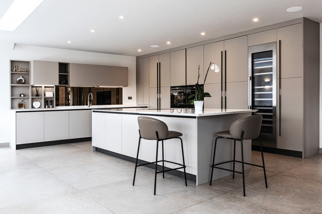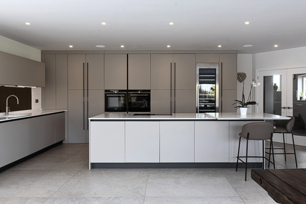 Sobre, elle s’harmonise parfaitement dans l’espace de vie. Les placards intègrent à la fois beaucoup de rangements, les électroménagers et même une porte secrète menant à la buanderie. Fonctionnalité et élégance sont les maîtres mots de ce projet.