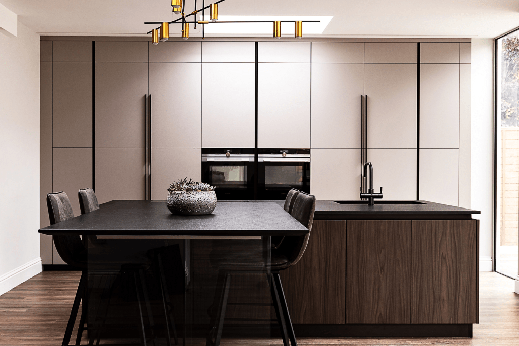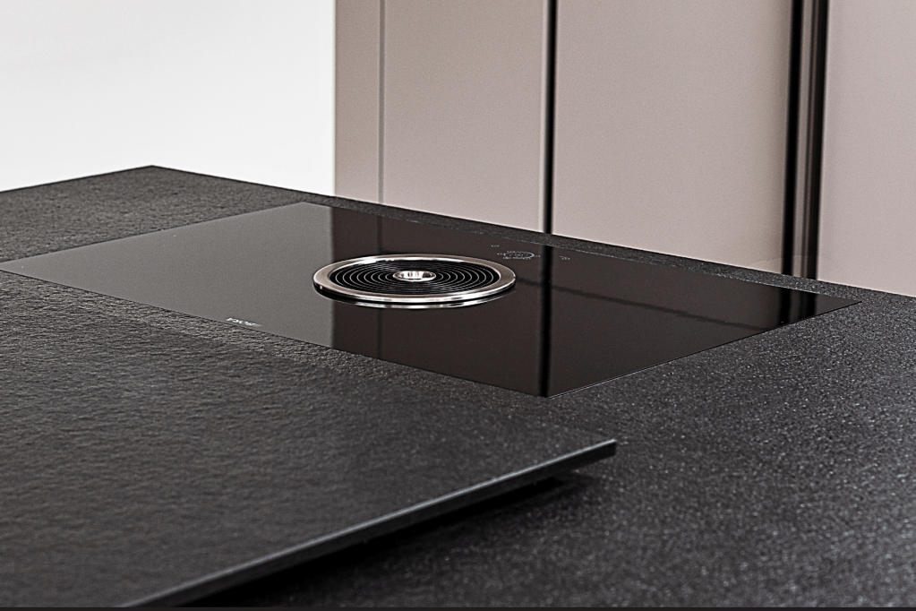 Sa sobriété fait d’elle un atout élégant dans le living. La beauté de l’îlot réside dans sa simplicité et ses lignes suspendues (la table reposant sur un pied de verre). Un plan de travail est dissimulé dans une armoire ajoutant de la fonctionnalité.