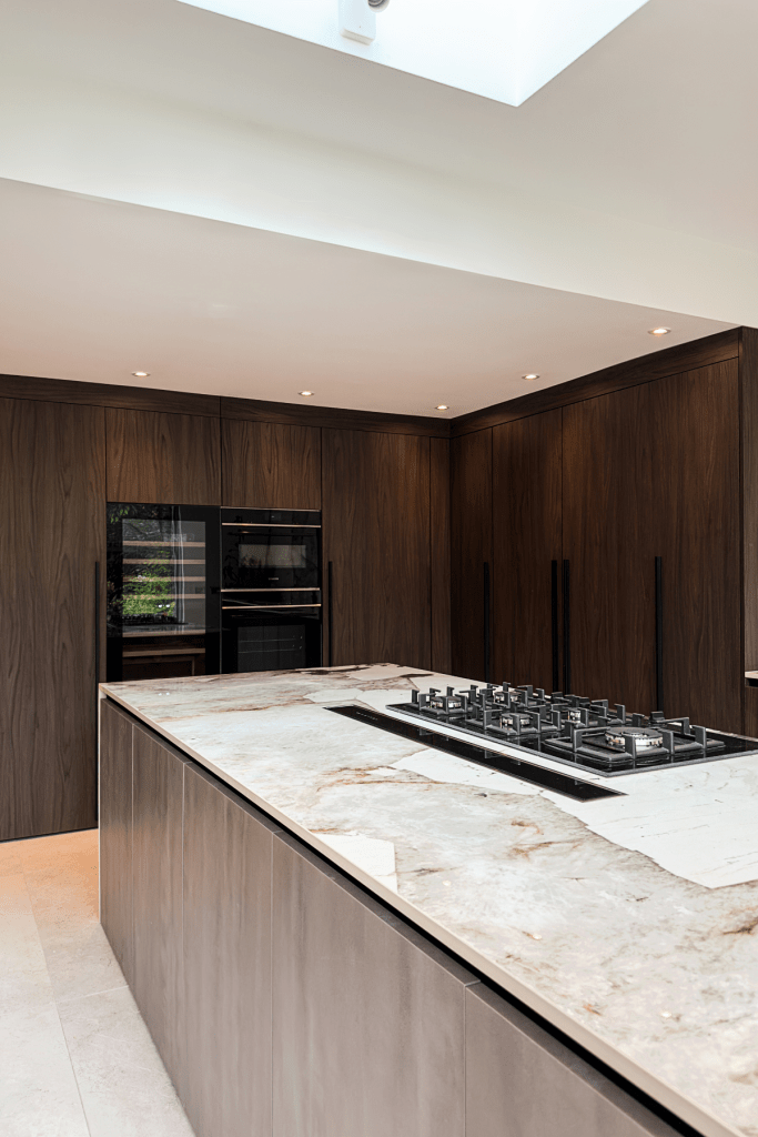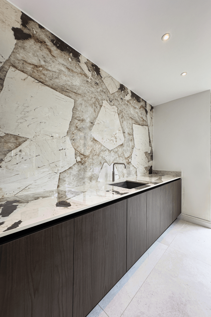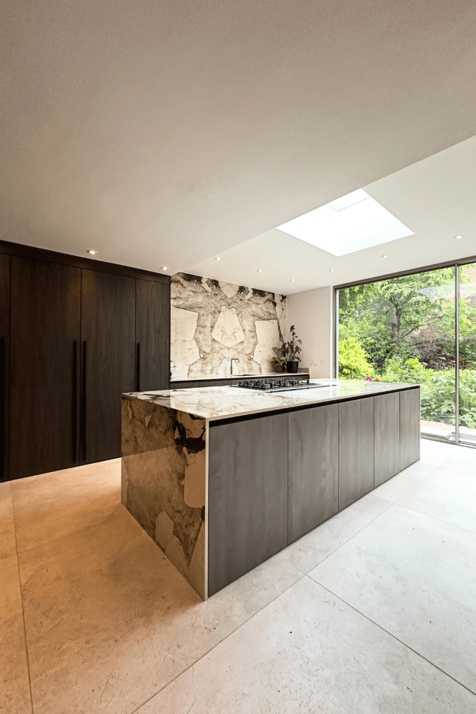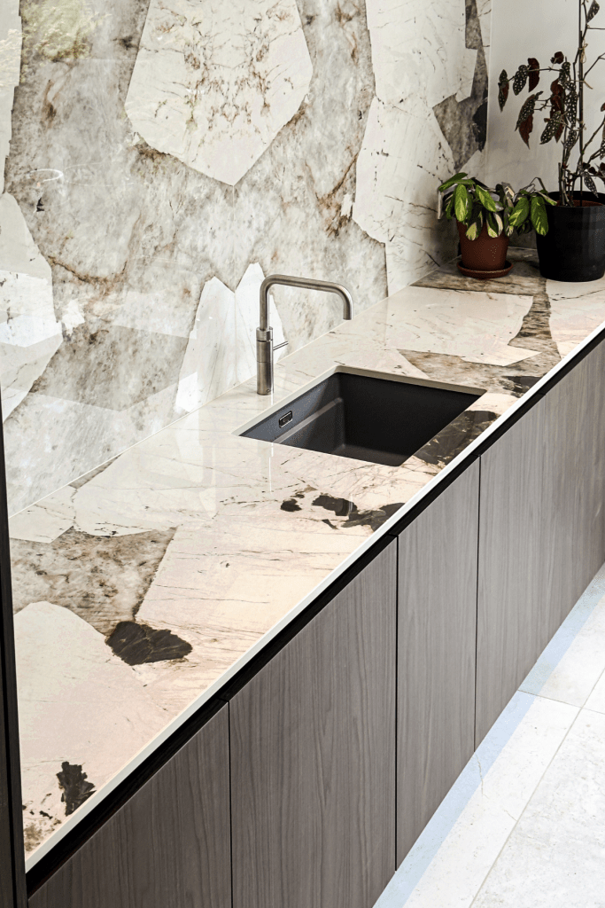 Les jeux de textures rendent cette cuisine hors cadre, hors norme. L’imposante crédence allant du plan de travail au plafond apporte un caractère grandiose à l’espace.