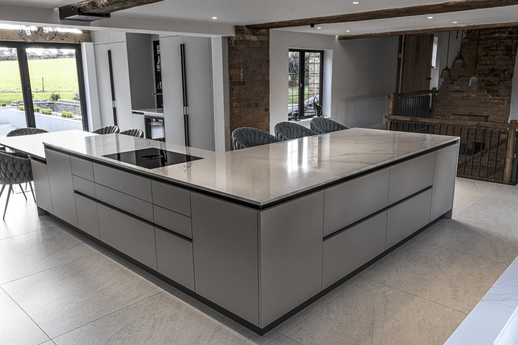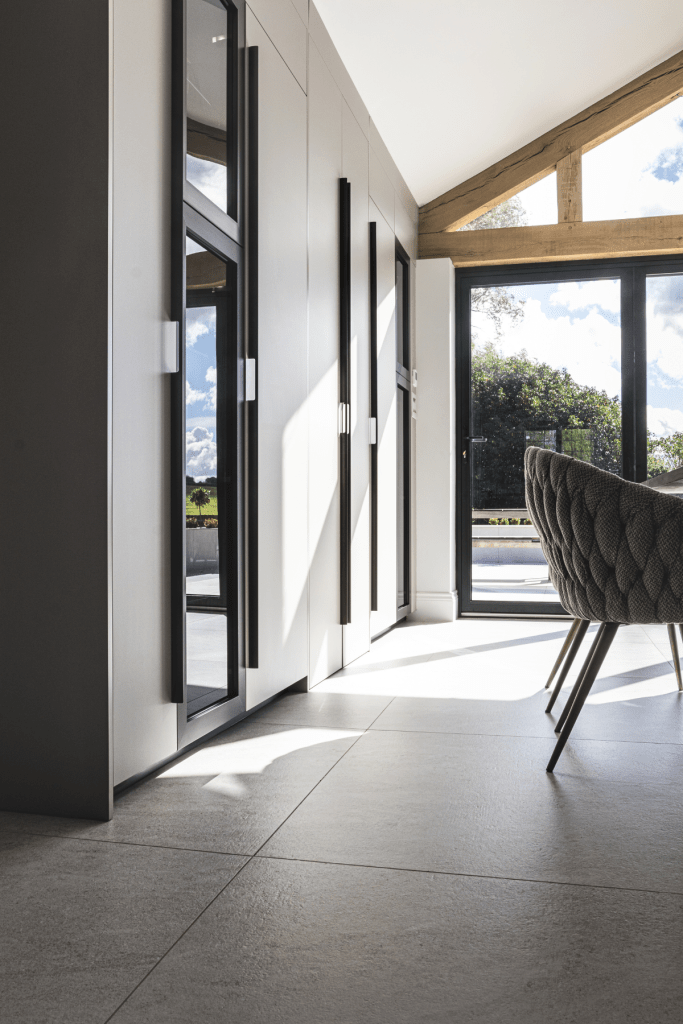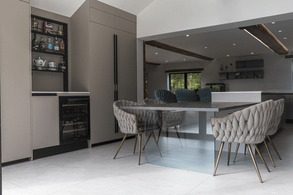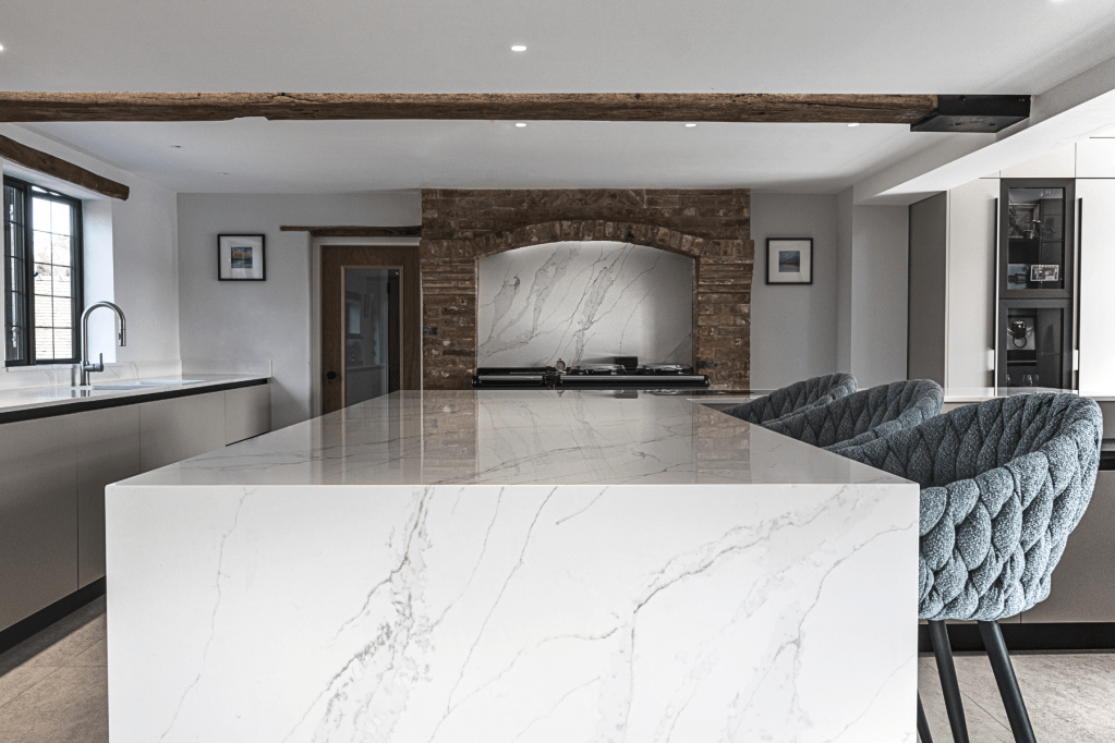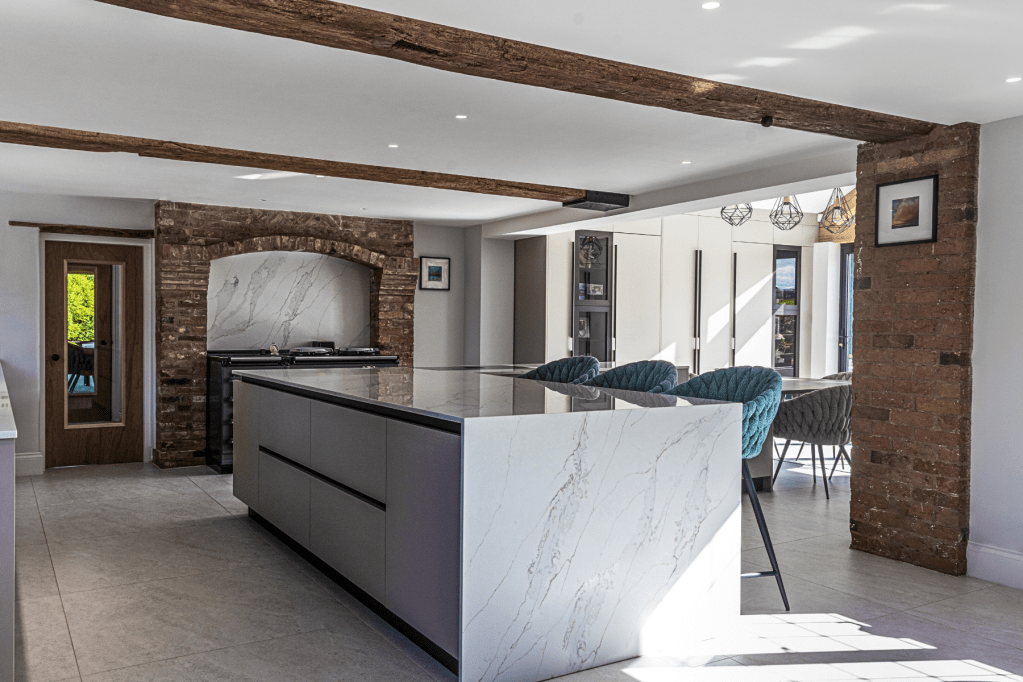 Des lignes épurées, des finitions simples, mettent en valeur le décor d’un corps de ferme réhabilité. Un magnifique piano de cuisson habille une ancienne cheminée. L’immense îlot central en forme de L épouse la forme de la pièce et vient optimiser l’espace.