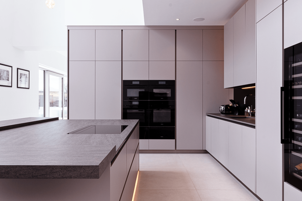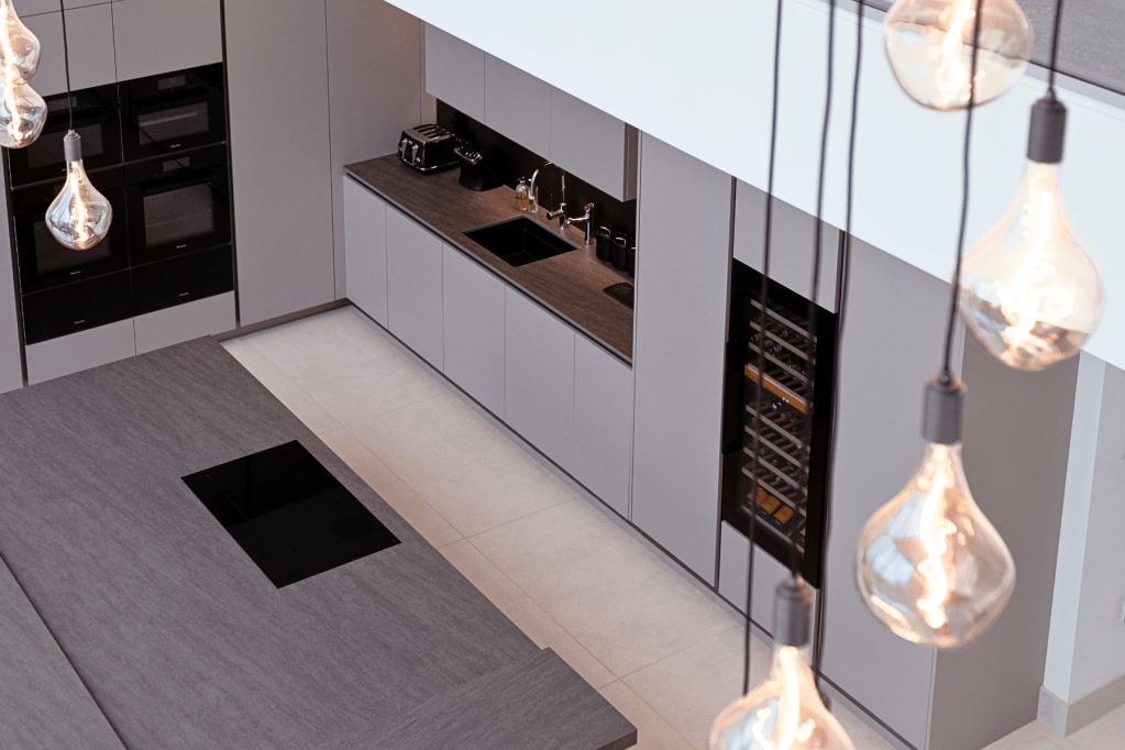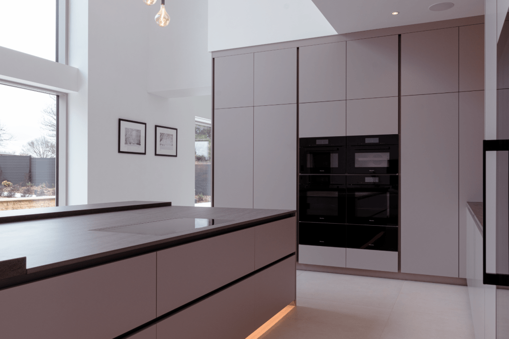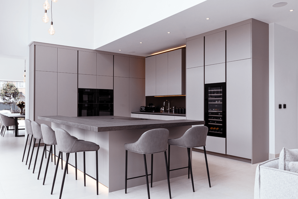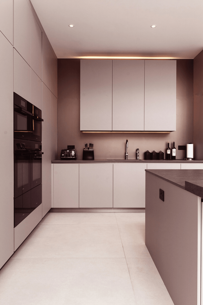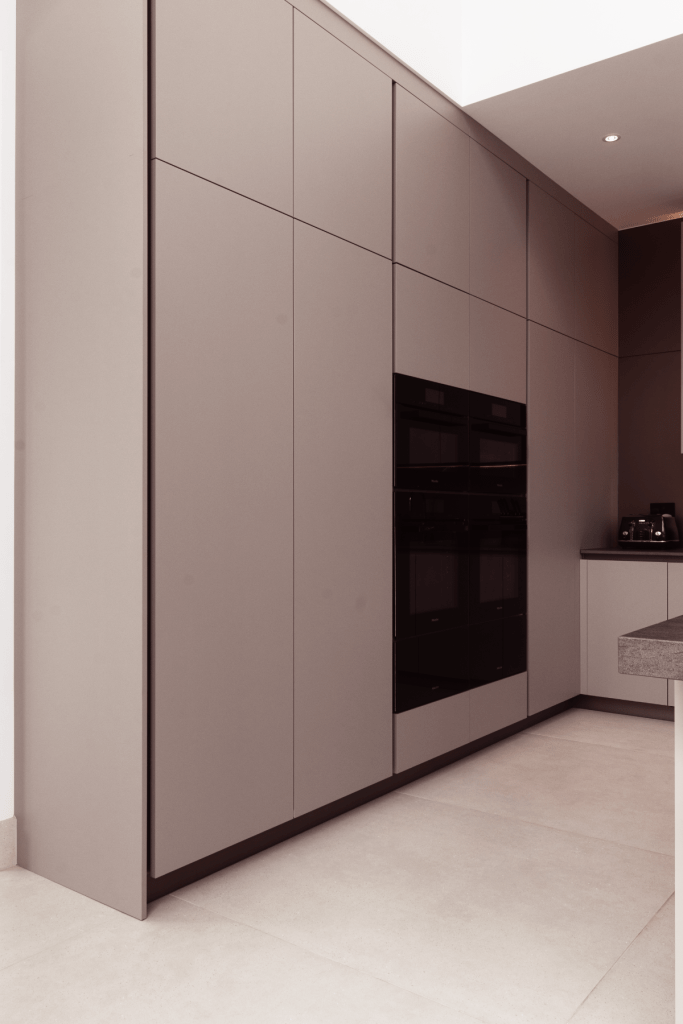 Les jeux de volumes créent un équilibre harmonieux et grandiose, ( A titre indicatif, les armoires de rangements mesurent plus de 3m30 de haut, et l’îlot offre une profondeur de plus de 1m90 ). L’ergonomie de cette cuisine n’en laisse pas moins la part belle au style. Les couleurs sont chaleureuses, avec des tons cuivrés, notamment pour la crédence en verre couleur bronze métallisé, qui s’étire jusqu’au plafond.