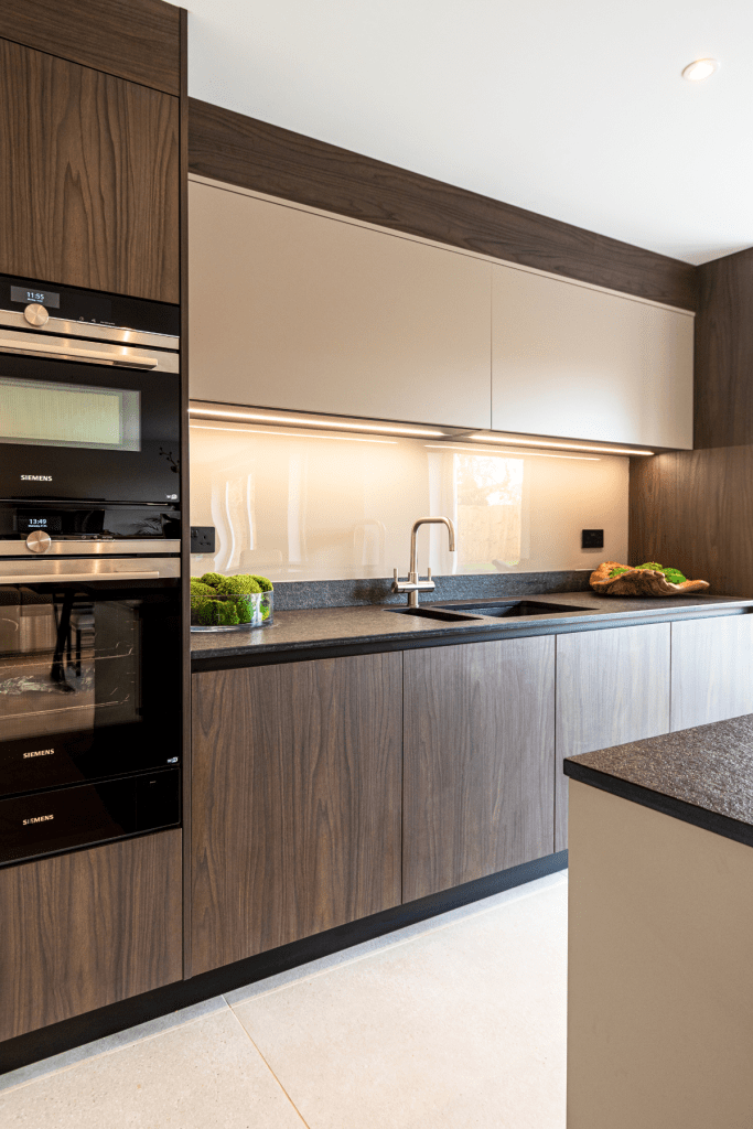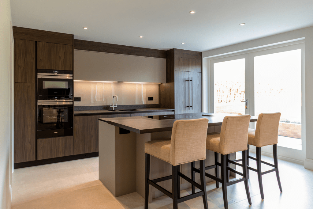 Elle allie la fonctionnalité, l’optimisation de l’espace avec l’esthétisme nécessaire aux cuisines ouvertes. Les couleurs sont monochromes, bois foncé, granit noir, pour une tonalité sobre.